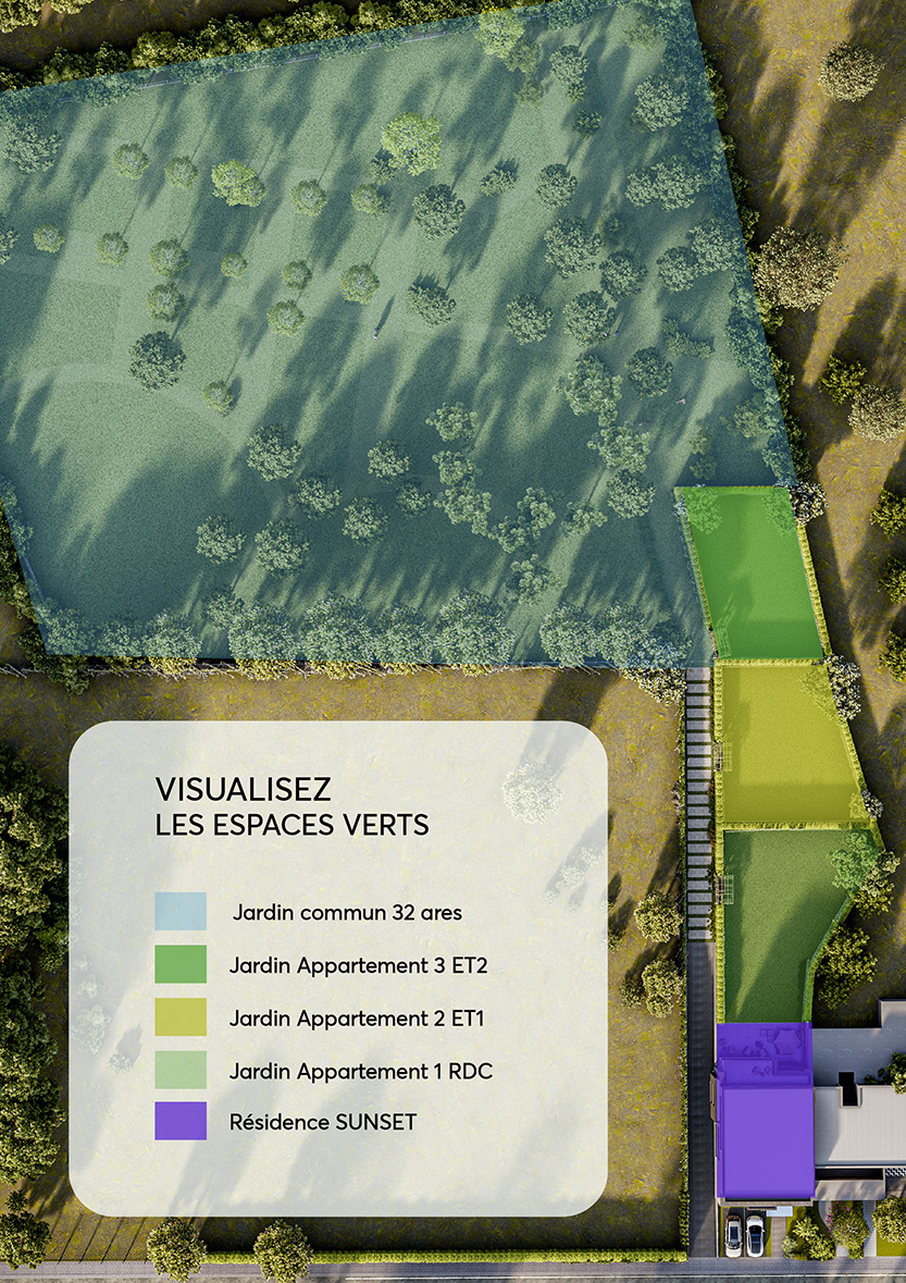 un jardin privatif de 230 m2 pour chaque appartement : à vous de voir comment en profiter ... installer les jeux des enfants ou un hamac confortable ou encore planter des fleurs