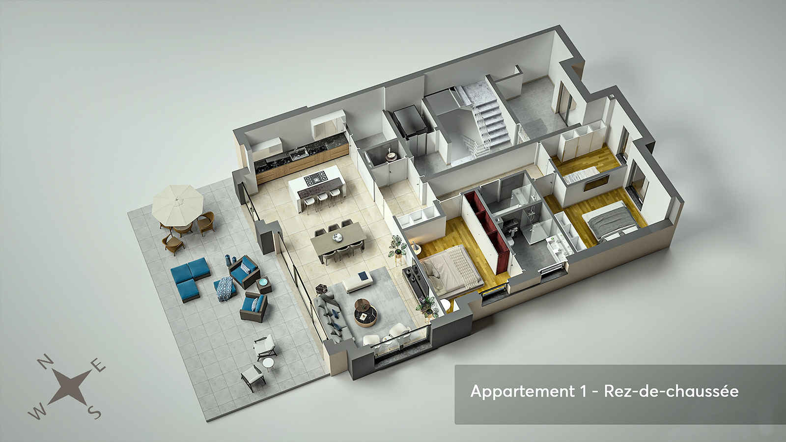 équipements premium : matériaux hauts de gamme, domotique pour le contrôle des volets, luminaires, chauffage, boite aux lettres intelligente, …